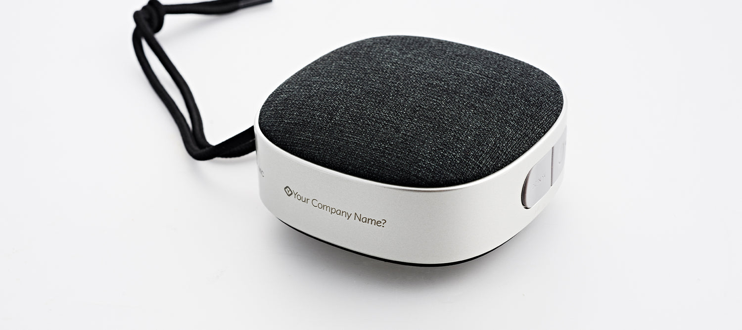 The speaker’s black-colored frame can be customized with your logo or slogan. Print in up to four colors. Getting your logo or slogan printed in a cool grey is a subtle nod to your brand that doesn’t overpower the design of the speaker, while a white or full color print of your logo will stand out against the frame and attract attention to your brand.