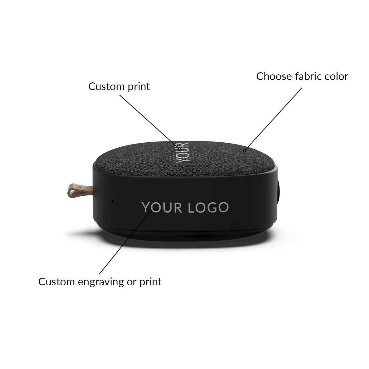 Customize the portable speaker with 1-4 color printing on the frame of the speaker or 1 color printing on the fabric front.