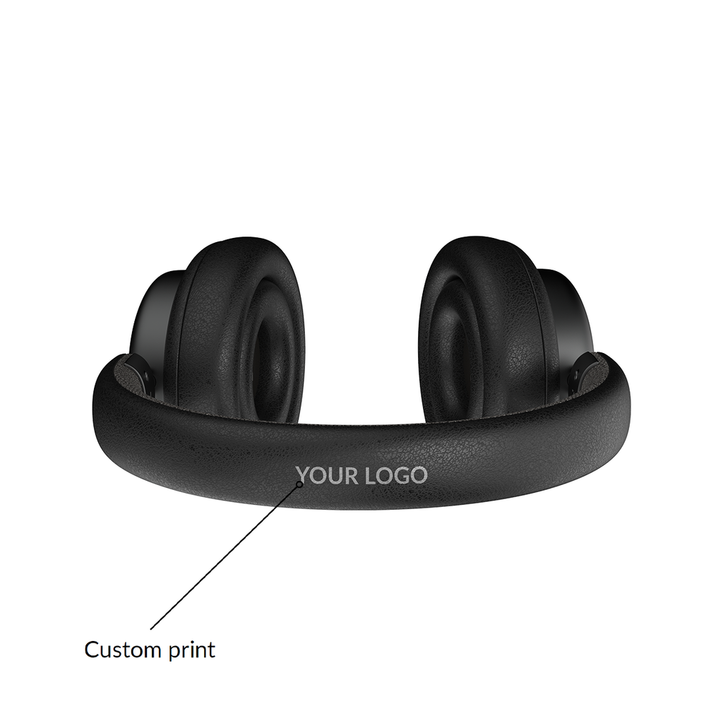 The PU leather headband of the headphones can be customized with 1 color printing. Getting your logo or slogan printed in a low-contrast color is a subtle nod to your brand that doesn’t overpower the design of the headphones, while a high-contrast color will stand out against the metal sides and attract attention to your brand.